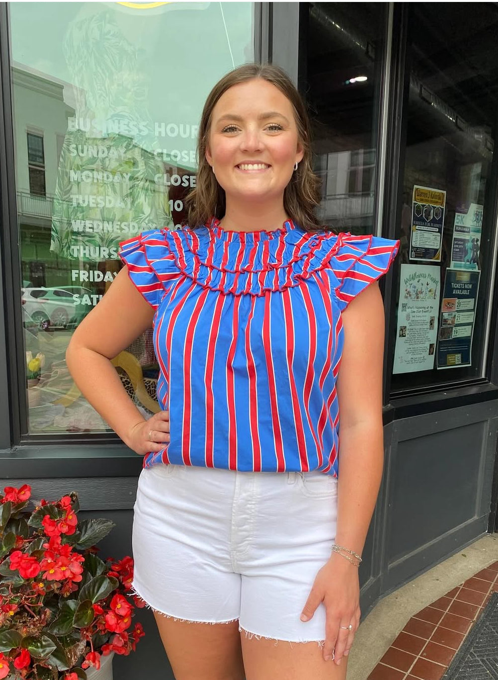 The American Dreams sleeveless shirt combines classic Americana style with a modern twist. Crafted from comfortable, breathable fabric, it features a distinctive striped pattern that adds timeless charm. The ruffle design at the chest enhances its feminine appeal, providing subtle texture and visual interest. Perfect for warm weather, its sleeveless cut allows ease of movement and a relaxed fit, making it an ideal choice for casual outings or summer events. This versatile top pairs effortlessly with jeans or skirts, offering a refined nod to patriotic fashion.