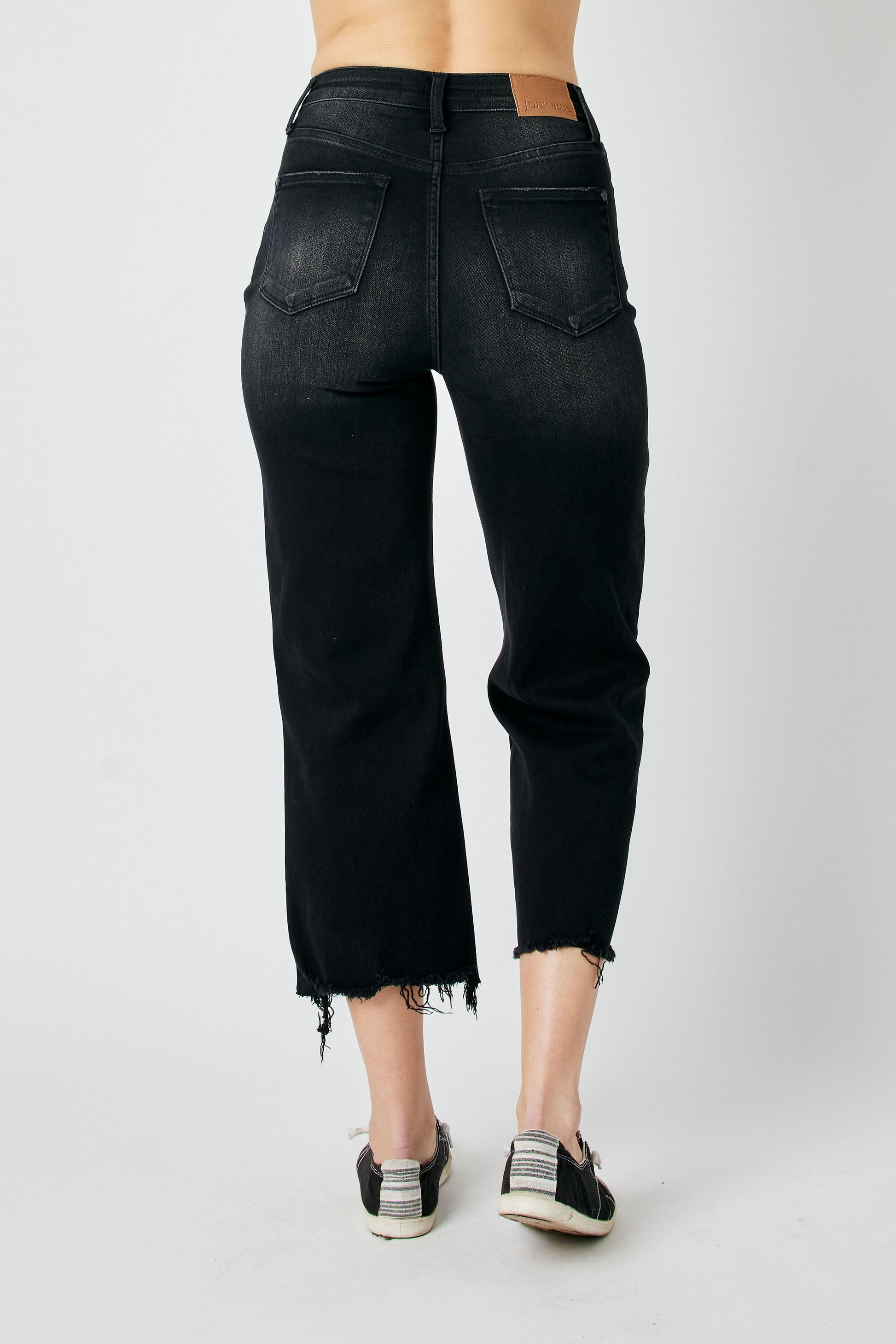 Meet your new go-to: the Black Crop JB jeans. These high rise beauties feature a playful destroyed hem that adds just the right amount of edge to your look. The classic button fly brings a vintage vibe, while the cropped length is perfect for showing off your favorite shoes or sneakers. Whether you're pairing them with a casual tee or dressing them up with a chic top, these Judy Blue jeans blend comfort and style effortlessly. Step out and turn heads with the cool confidence that only the Black Crop JB can deliver!