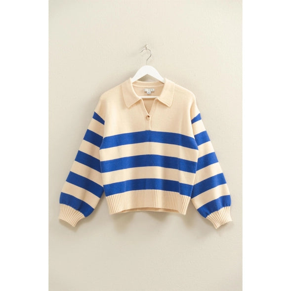 Stay warm and fashionable with this thick, high-quality sweater featuring a delightful collar, playful button accents, and trendy balloon sleeves. The vibrant blue and cream stripes add a burst of fun to your outfit, making it an ideal choice for brightening up chilly days. Whether you’re off for a casual outing or simply enjoying a relaxed day, this sweater blends comfort and charm to keep your look lively and cheerful throughout the season.