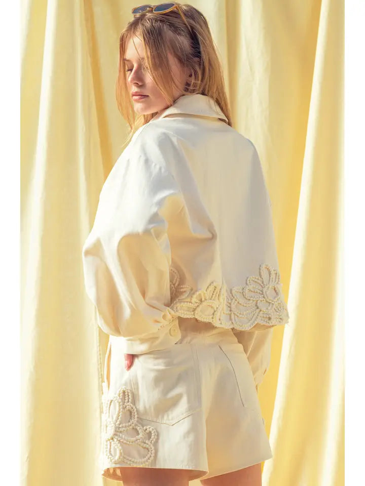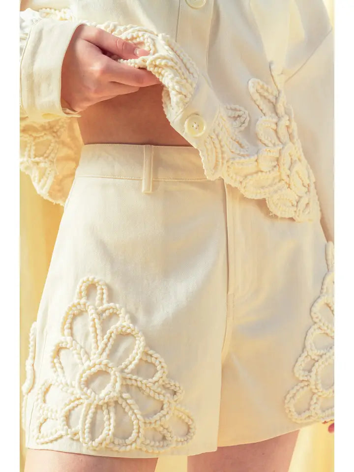 Off-white denim shorts that bring the fun with delicate floral embellishment details scattered across the fabric. Perfect for adding a touch of whimsy to your everyday wardrobe, these shorts combine classic denim comfort with a charming botanical twist. The light wash pairs effortlessly with everything from casual tees to dressy tops, making them a versatile staple for spring & summer. Whether you're heading to brunch, running errands, or enjoying a night out, these playful shorts deliver style with personality. The floral accents catch the light beautifully, giving you that extra something special that turns a simple pair of shorts into a statement piece.