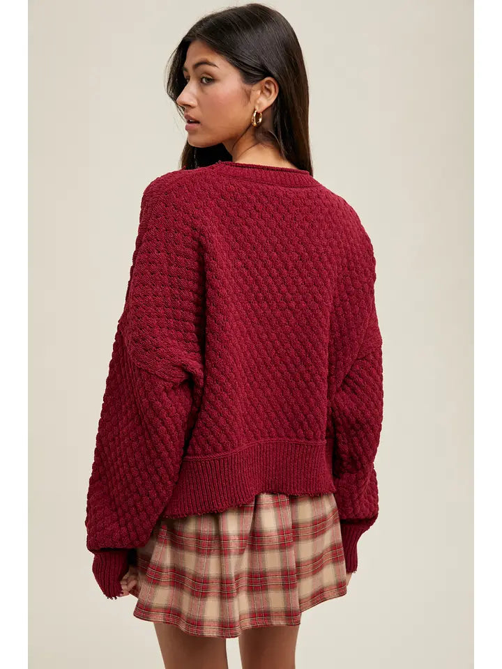 This cropped wine-colored crewneck sweater combines contemporary style with subtle texture for a sophisticated finish. Its warm hue enhances your seasonal wardrobe, while the textured knit adds depth and visual interest without overwhelming your look. Designed with a comfortable crewneck silhouette, this piece offers versatility for layering or wearing alone. Perfect for expert styling, it balances fashion-forward design with wearable comfort, making it an essential addition to your collection.
