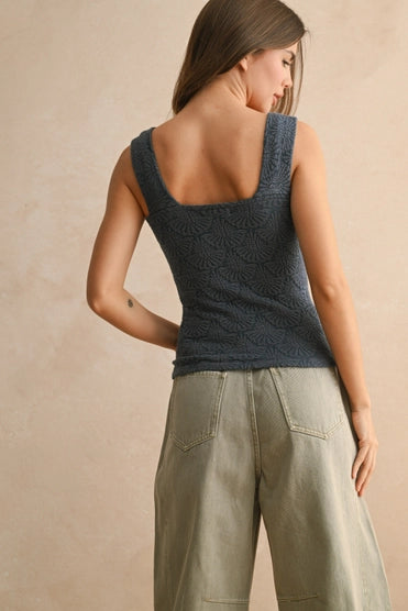Embrace whimsy with this Dusty Daydreams tank top, featuring a charming cornflower blue hue that brightens any outfit. Its textured fabric adds a touch of playful depth, while the flattering square neckline offers a stylish frame for your favorite accessories. Perfect for sunny days and carefree adventures, this versatile piece brings a dash of effortless charm to your wardrobe.
