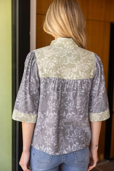 This lightweight 3/4 sleeve top combines comfort and style with its breathable fabric and flattering silhouette. The split neck design is enhanced by a sophisticated gray and green colorblocking, creating a subtle yet striking contrast. The monotone floral print, harmonizing with the top’s base color, adds an elegant touch without overwhelming the look. Ideal for layering or wearing on its own, this versatile piece is perfect for transitional weather and adds refined visual interest to any wardrobe.
