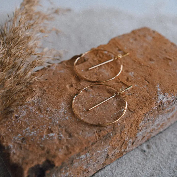 Add a touch of sparkle and style with these charming gold hoops! Featuring a dazzling CZ bar post and a sleek, shiny gold bar that dangles playfully in the center, they bring fun and elegance to any outfit. The 14k gold plating adds a luxurious gleam, making these earrings perfect for both everyday wear and special occasions. Let these unique hoops be your new go-to accessory for a subtle yet standout look!