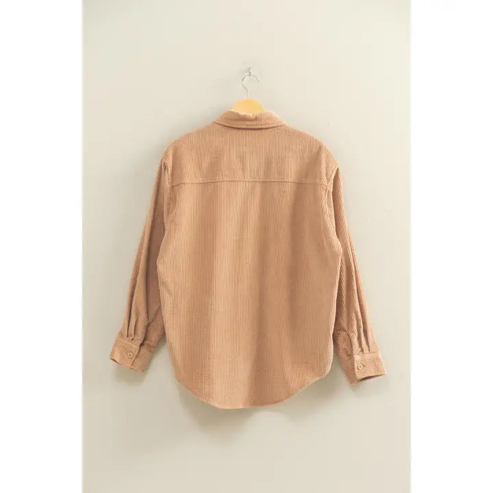 This beige button up corduroy top brings cozy charm to your everyday style. Soft yet sturdy, its textured fabric adds a touch of vintage flair while keeping you comfortably warm. Perfect for layering over tees or pairing with your favorite jeans, this top makes casual outings feel effortlessly stylish. The buttons add classic detail, making it easy to dress up or down, ideal for those who love a playful spin on timeless wardrobe staples.