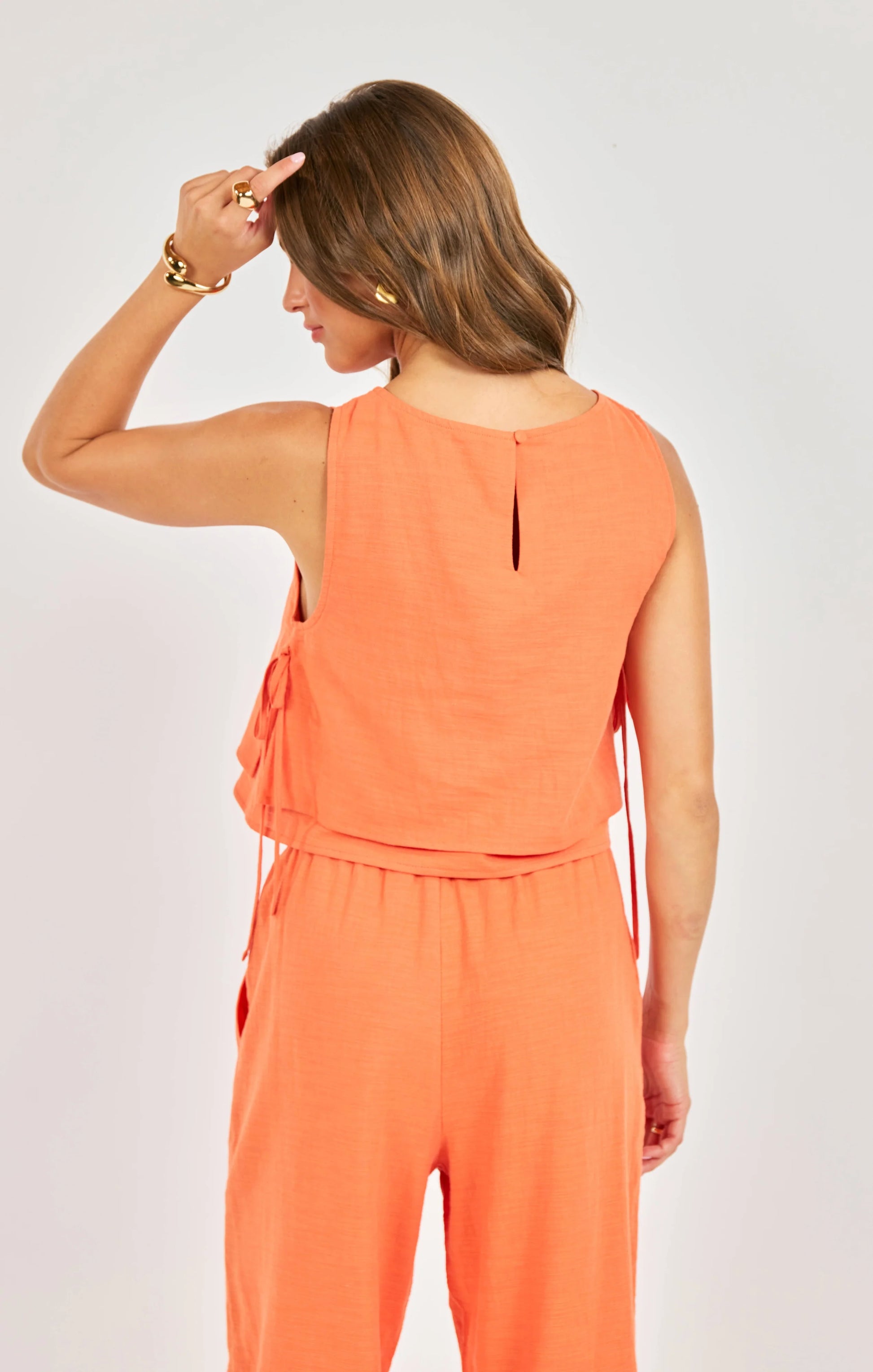 Elevate your Spring style with this striking orange Sadie & Sage set, featuring a modern layered silhouette and functional side-tie details that blend playful charm with polished sophistication. The double layered front offers adjustable styling versatility, while the bold citrus tone and clean lines create an effortless warm weather look. Perfect as a seasonal statement piece or mixing and matching with your other favorite summer staples like denim shorts or a white button up blouse.