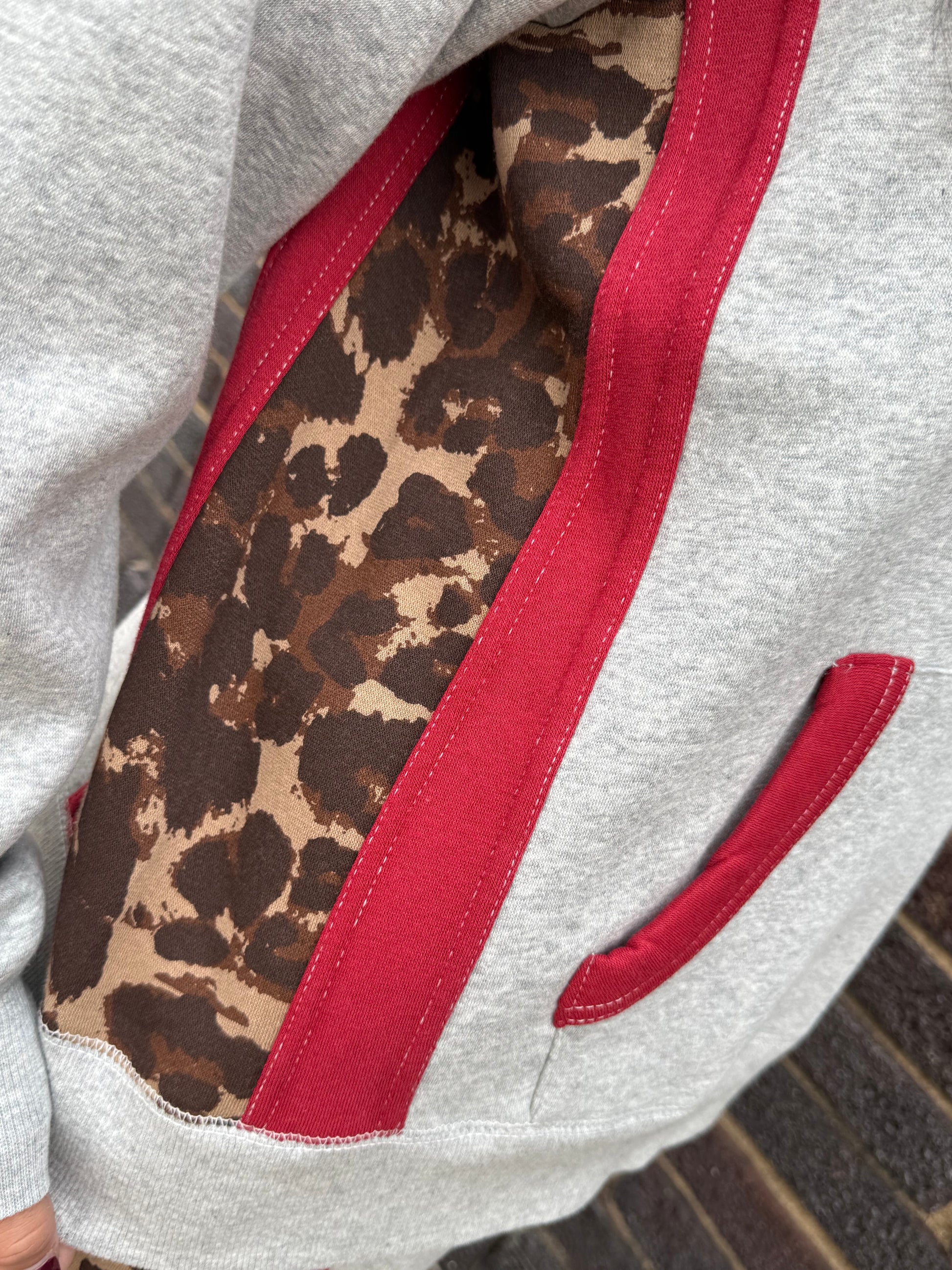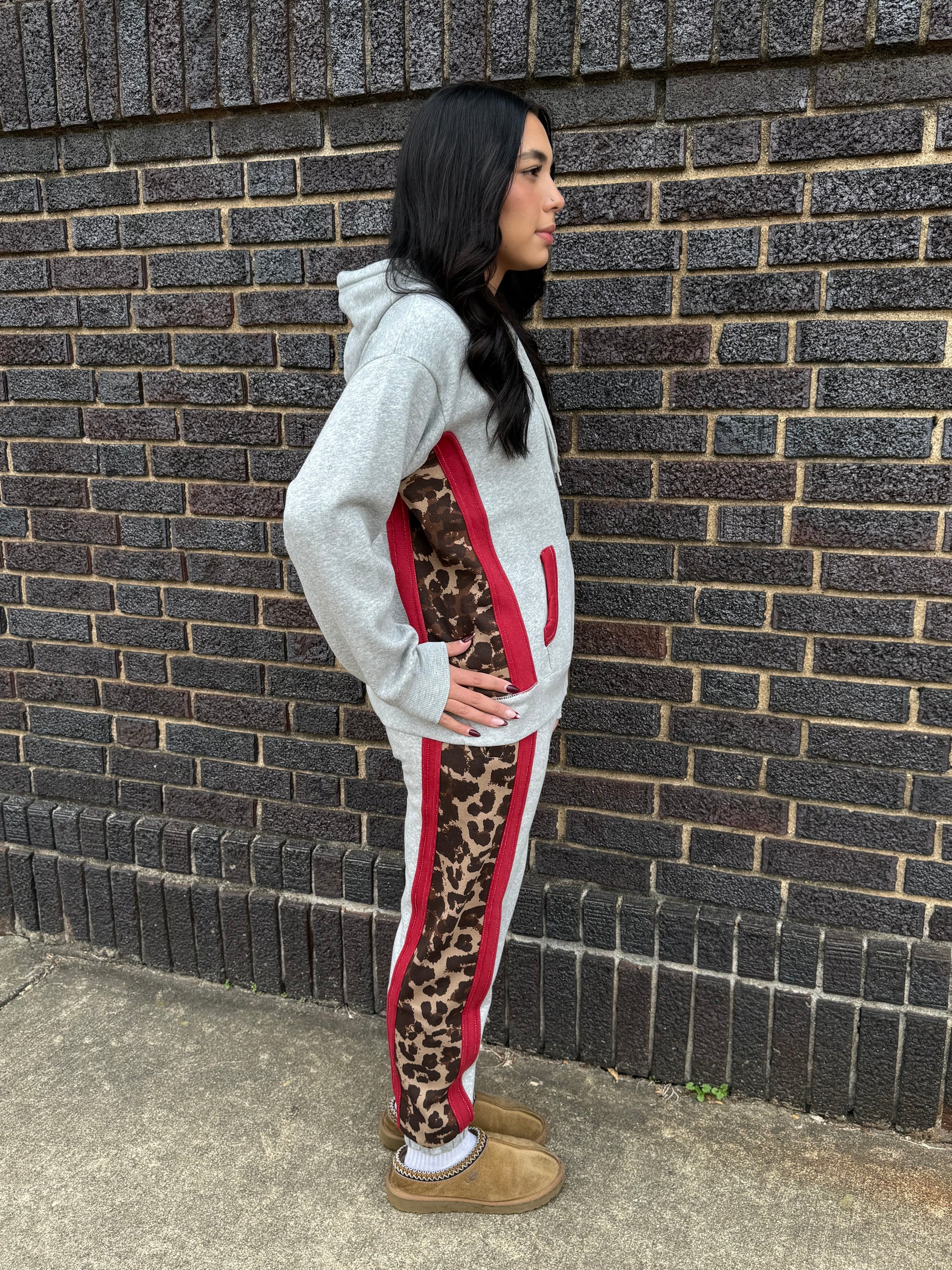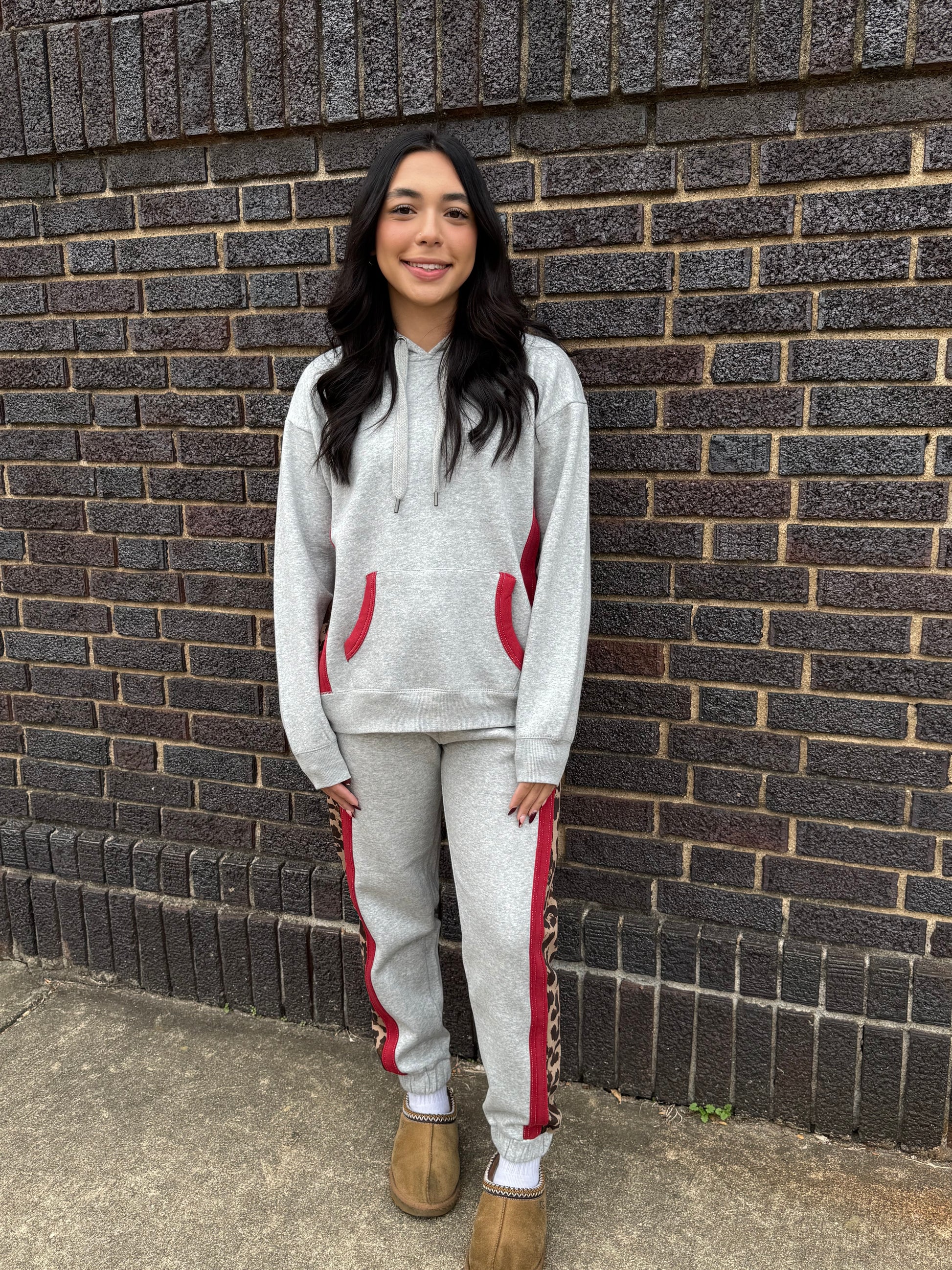 The Hot Spot Hustle Set takes cozy to the next level with its heavier gray fabric, designed to keep you warm and comfortable all day long. This playful sweatsuit stands out with striking red and leopard trim accents that add a touch of bold flair to your casual wardrobe. The jogger-style pants offer a relaxed fit with a snug cuff at the ankle, while the hooded sweatshirt features a roomy hood and kangaroo pocket for added practicality. Whether youโre kicking back at home or stepping out with confidence, this set makes it easy to combine comfort with a fiery sense of style. Perfect for those who love mixing cozy vibes with a splash of attitude.