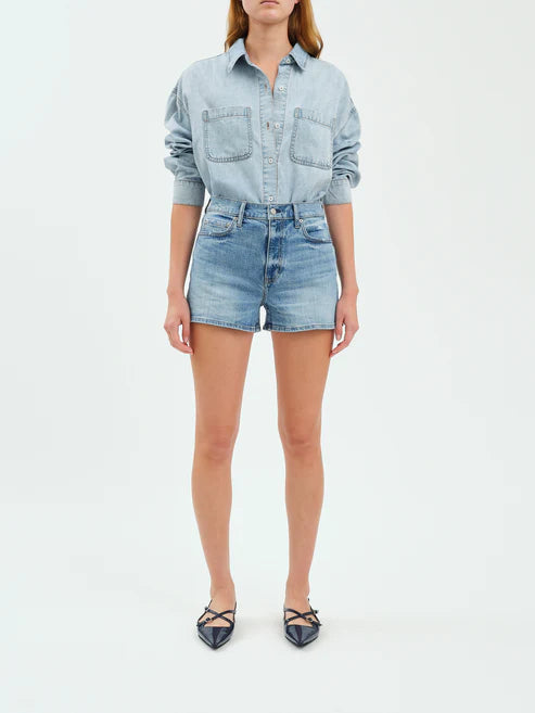 Get ready to steal the spotlight with the Marina Vintage denim shorts from Daze Denim. These shorts feature a waist-defining high rise that flatters your figure, paired with clean, crisp hems for a polished look. The versatile medium wash makes them perfect for just about any outfit, from casual hangouts to sunny adventures. Crafted from Tough Love fabric, they deliver the perfect balance of sturdy structure and gentle stretch, shaping to your body while keeping their cool vintage vibe. Playful, practical, and effortlessly stylish, these Daze Denim shorts are made to move with you all day long!