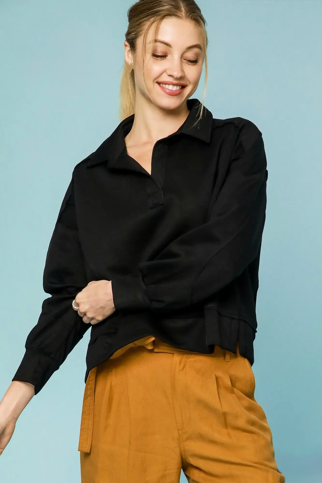 Slip into effortless comfort with our Midnight V Neck, a silky sweatshirt that's equal parts cozy and chic. The slightly cropped cut flatters your frame while the deep v-neckline adds a touch of sophistication, and the collar keeps things polished. Whether you're lounging at home or running errands, this versatile piece pairs beautifully with our Jogger Sweats for an athleisure vibe or dress it up with Lounge Pants for ultimate relaxation. The luxurious silky fabric feels as good as it looks, making this your new go to layer for any laid back moment.