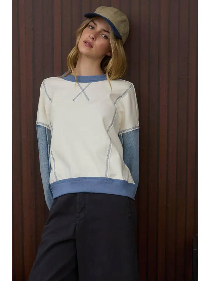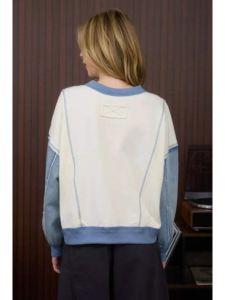 Meet your new favorite layering piece!!! The Mix Media top brings together the best of both worlds with its cozy knit body and cool denim sleeves. Dressed in a creamy neutral shade, it's the perfect canvas for mixing and matching with everything in your closet. Whether you're going for casual cool or dressed up vibes, this playful texture combo keeps things interesting and fun.