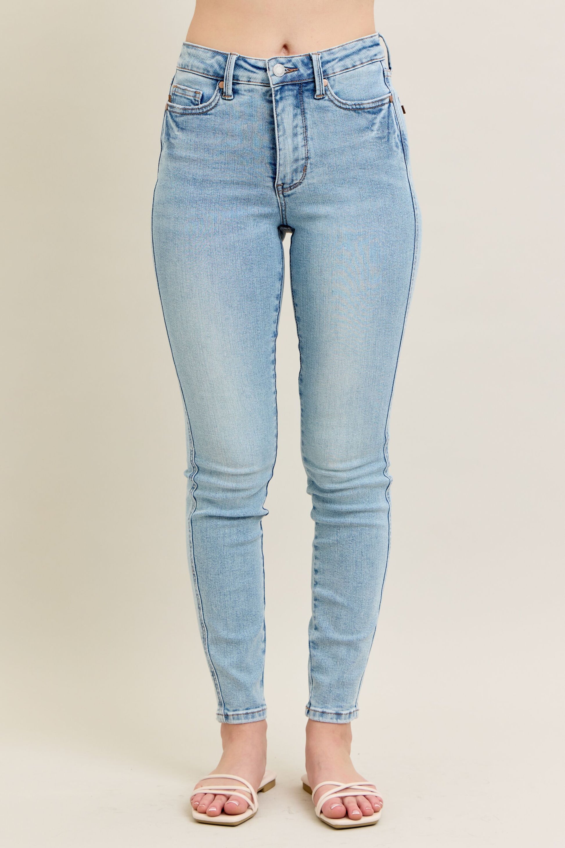 The Judy Blue MR TC Light Skinny jeans combine a flattering mid rise fit with tummy control technology to give you confidence and comfort all day long. Featuring a vintage wash, these skinnies add a touch of timeless style while hugging your curves in all the right places. Whether you're dressing up or down, their sleek silhouette keeps your look fresh and playful. Perfect for those who want a little extra support without sacrificing style, these Judy Blue jeans will quickly become a favorite in your wardrobe.