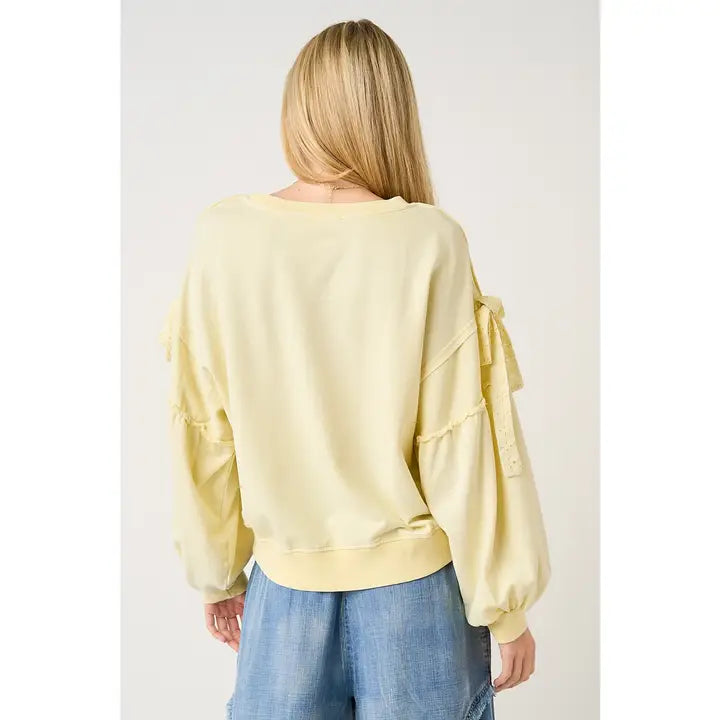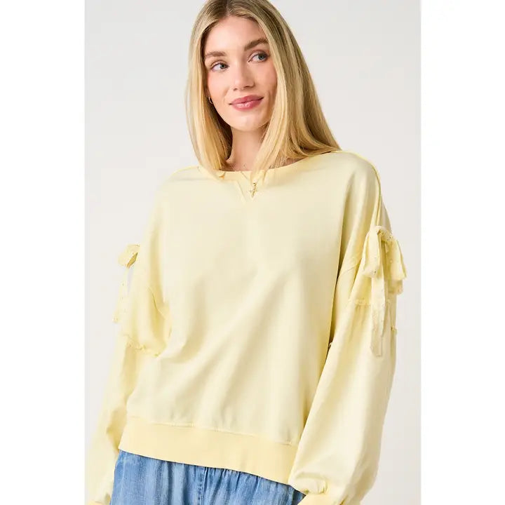 Meet your new favorite layer, a feather light sweatshirt that's as fun to wear as it is comfortable. Available in two dreamy pastel shades, this piece brings effortless style to any casual wardrobe. The timeless crewneck pairs beautifully with the statement making balloon sleeves, each one adorned with a sweet bow applique that adds just the right amount of charm. Whether you're curling up with your favorite book, running errands around town, or grabbing coffee with friends, this sweatshirt delivers all-day coziness without weighing you down. The soft fabric feels like a gentle hug, making it the perfect go to for anyone who refuses to sacrifice style for comfort. Playful, practical, and utterly lovable.