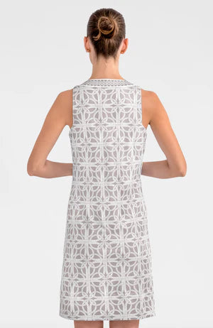 This effortless sleeveless dress brings understated elegance with a playful twist. Featuring a chic slit neckline and a sophisticated taupe palette, it's finished with contrasting fabric details along the back panel, side seams, and collar edge for visual interest. The 36" length and hand hemmed finish add refined touches.
