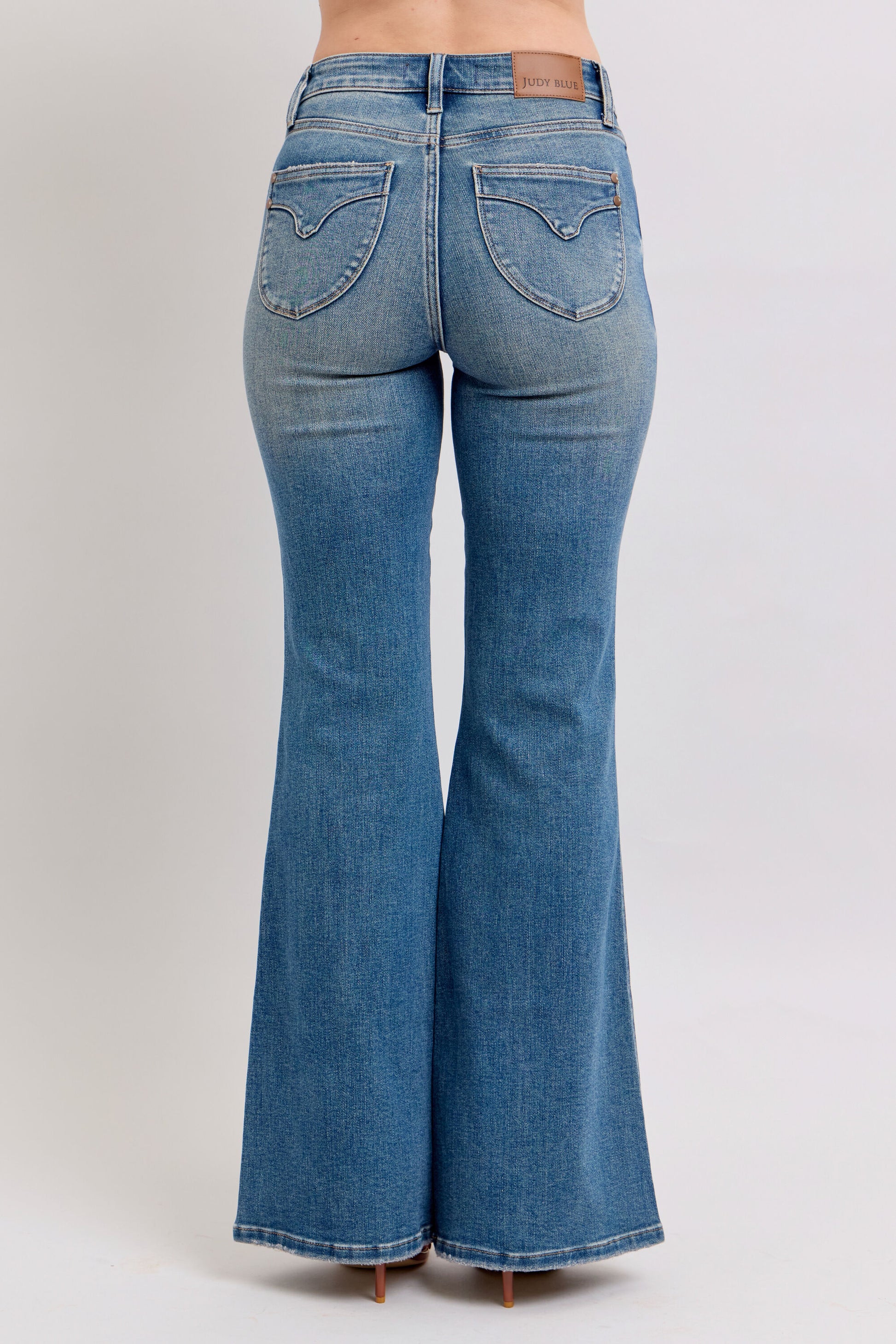 Step out with confidence and flair in the Shield Flare jeans. Designed with a mid-rise fit and tummy control to smooth and flatter your silhouette, these Judy Blue jeans combine comfort with a flattering shape. The vintage wash brings a trendy, worn in look that adds character to any outfit, while the back shield pockets offer a playful twist on classic denim styling. Whether you're dressing up for a night out or keeping it casual, the Judy Blue Shield Flare’s flattering fit and fun details make them a wardrobe essential that’s ready to turn heads.