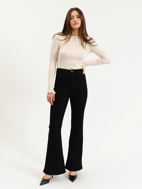 The DAZE Denim Sunset Flare in 'After Party' is a high rise flared jean in a clean black wash. This flattering fit hugs you at the waist and flares dramatically from knee to ankle. Constructed from DAZE Denim's "Hug Fabric," this jean is flexible enough to hug your body, yet heavy enough to cinch you in.