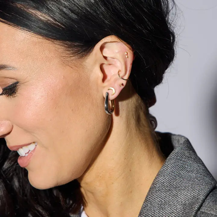 Fierce, spontaneous, but oh so fabulous, these two tone huggies are your new go to for effortless edge. Featuring a gold side and silver side, allowing you to switch them around and change up your look! Whether you're dressing up for a night out or elevating your everyday look, these versatile beauties work with everything. Crafted with PVD plating for durability and waterproof protection, they're built to keep up with your lifestyle without sacrificing style. Mix metals, mix vibes, mix it all up, these huggies are ready for whatever you throw at them.